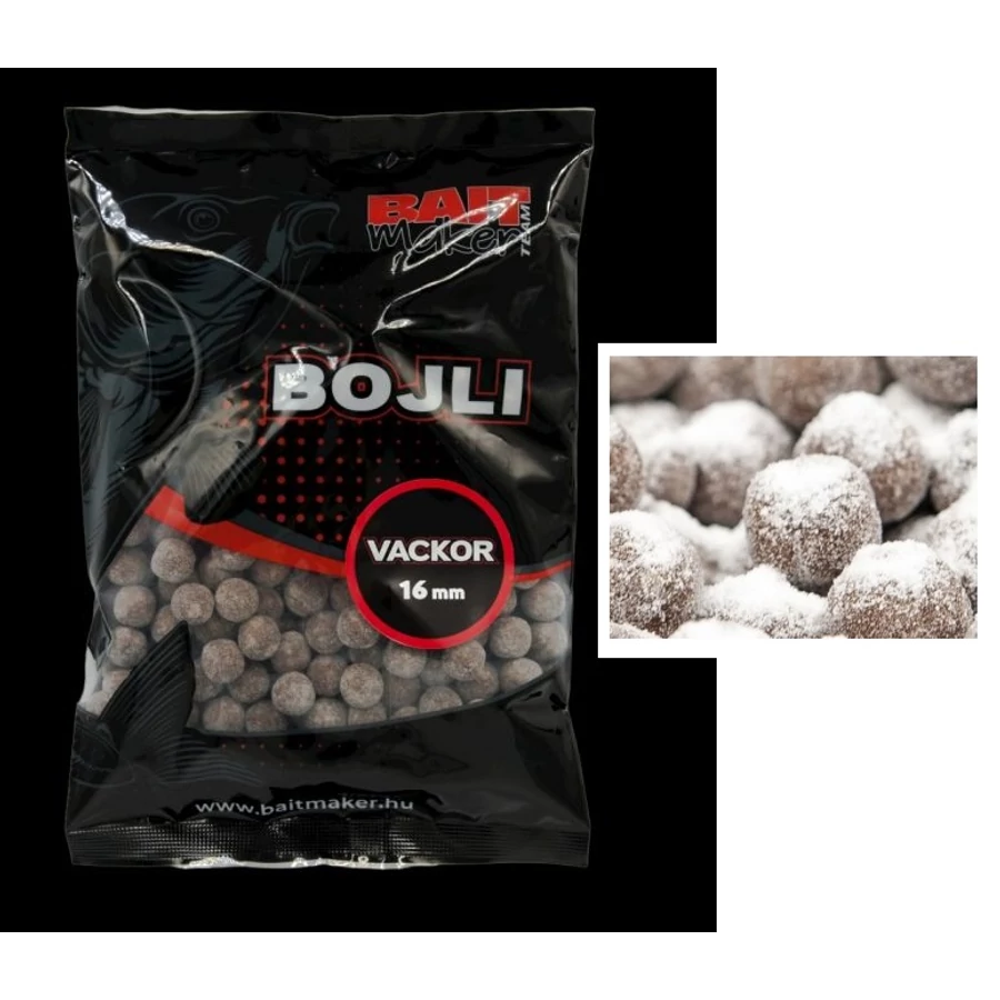 Vackor: Hallisztmentes, növényi, és állati fehérjés univerzális bojli a Bait Maker kínálatából. Mivel hallisztet nem tartalmaz, anyagösszetételének köszönhetően, nagyon magas biológiai értékkel rendelkezik. A bojliban, mind a növényi, mind pedig az állati fehérjék kulcsfontosságú szerepet töltenek be. Rengeteg vízoldékony anyag található benne, amelyek vízbejutást követően, folyamatosan jeleket küldenek a környéken táplálkozó pontyoknak, hogy természetazonos táplálék lelhető fel a környéken. Nincsenek a golyóban olyan dermedéspontú olajok, és zsírok amik, hideg vízben ledermednek, és ezen tulajdonság miatt a csalit zárttá tennék, ezért egy igazi négy évszakos csalit vehetünk a kezünkbe. A bojliban a tejfehérjék, és a növényi összetevők mellet helyet kaptak különböző madáreleségek, és piskóta őrlemények. A vonzerőért a különböző cukrok, mellet a betain, lizin, metionin a felelős, ez párosul az érett körte zamatos illatával.