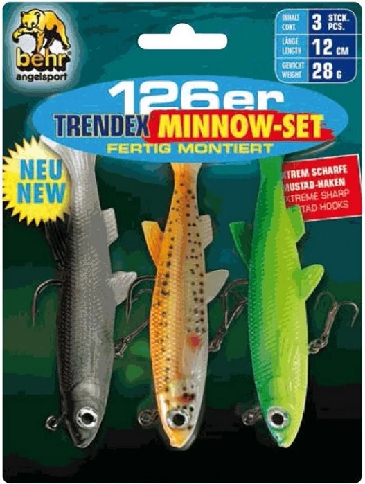 Ez a Behr Trendex Minnow készlet 3 lágy csaliból áll, beépített jigfejjel és egy hármas horoggal a hasoldalon. Minden csomag 3 különböző színű halat tartalmaz. Ezek a lágy csalik gyönyörű felülettel és fantasztikus akcióval rendelkeznek a víz alatt, melyet a realisztikus szemek tovább fokoznak.