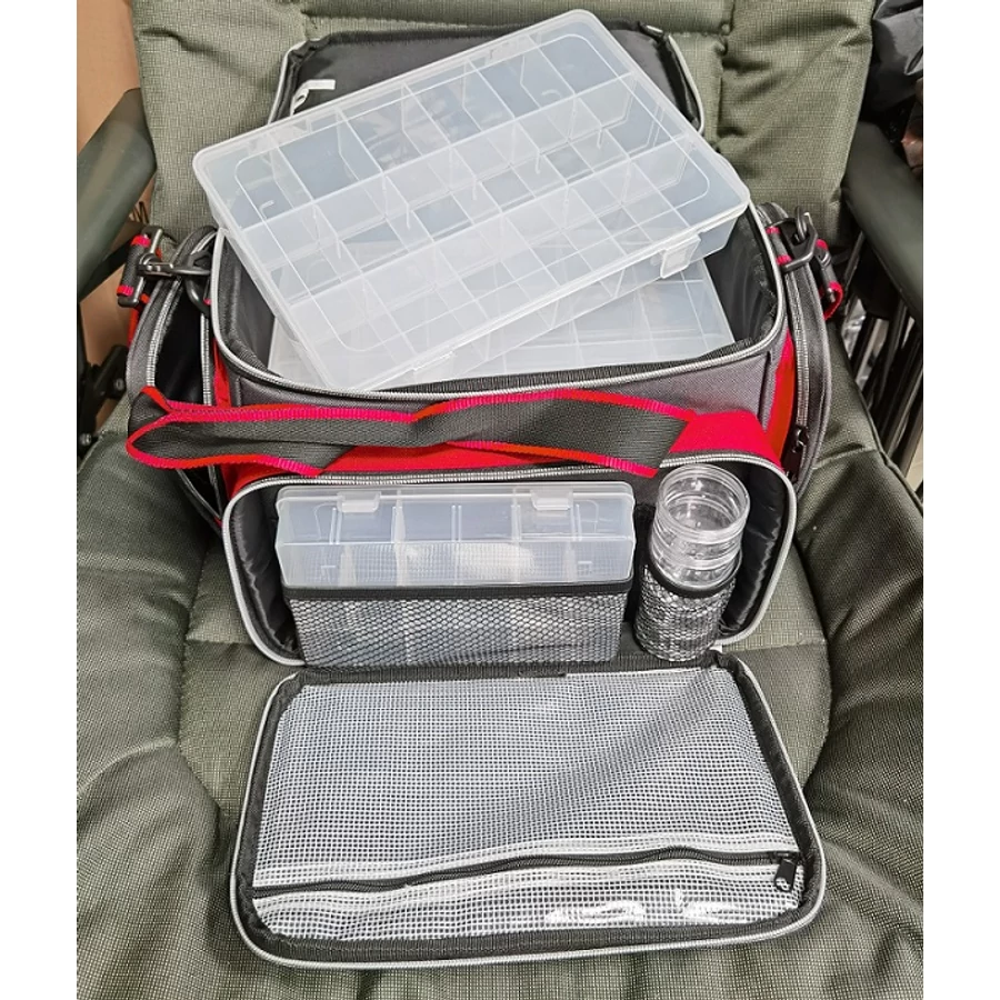 A táska fő részében 5db 27x18x4cm-es, variálható fakkos doboz található.