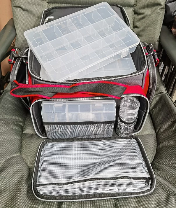 Összesen 3 db oladzsebbel rendelkezik, ezek közül az elülső nagyobb rekesz tartalmaz egy 20x14x4cm-es fakkos dobozt, illetve egy 5x13cm-es hengeres, 5 tégelyből álló tárolót. Szintén ebben a részben kapott helyet egy vízhatlan cipzáros irat/telefontartó zseb.