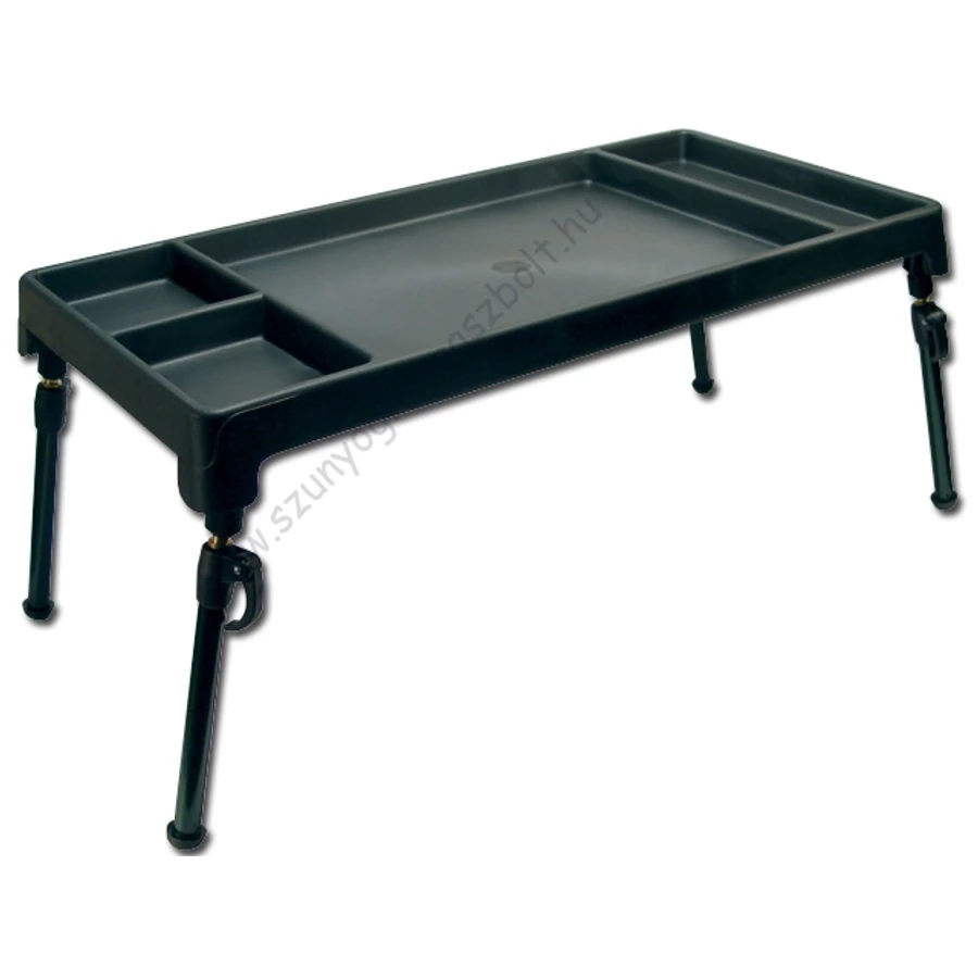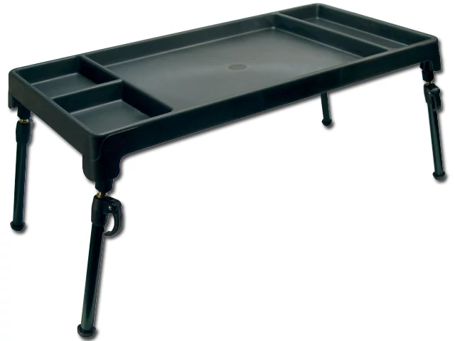 Hasznos segédeszköz a szerelékes asztal, ami kimondottan a horgászok részére lett kifejlesztve . A masszív asztallapon süllyesztett fakkokat találunk, ami megakadályozza hogy a kiegészítők leguruljanak és leessenek a földre . Teleszkópos lábainak köszönhetően gyorsan beállítható a kényelmes magasságra akár egyenetlen talajon is . A lábak behajthatóak ezért praktikusan kis helyen szállítható. Az osztott asztallapon jól elkülönítve tárolhatjuk az apró cikkeket,csalikat,dippeket és a szerszámokat .
