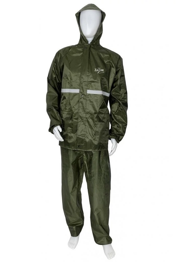 Ellenálló, gumírozott anyagból készült, kétrészes esőruha. A felsőrész csuklója gumírozott, megakadályozza az eső bejutását. A kapucni a nyakrésznél található madzaggal összehúzható, a nadrág dereka gumírozott. A cipzár masszív kialakítású, összehúzás után patentokkal ellátott résszel teljes hosszában elrejthető, így kizárt annak a lehetősége, hogy a cipzáron keresztül nedvesség jusson a ruha alá. A felsőrészre két nagyméretű zseb és elöl hátul fényvisszaverő csík került. Kis helyet foglal, a tavaszi és őszi változékony időjárás alkalmával hasznos kiegészítő. Többféle mérertben kapható, így mindenki ki tudja választani a számára leginkább megfelelőt.