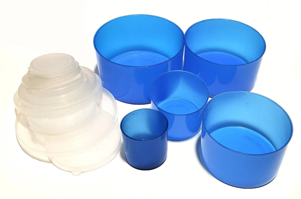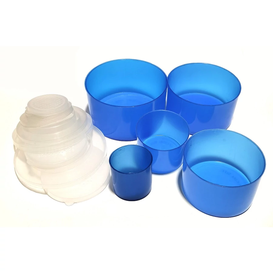 Öt efedeles, kerek dobozból álló limit edény készlet, amely megfelel a nemzetközi előírásoknak. Az edények egymásba rakhatók, így a szett kis helyen elfér.