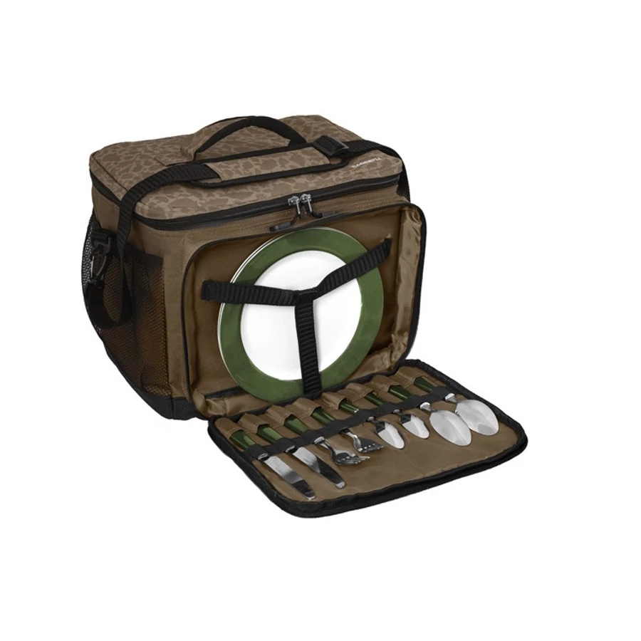 A táska elején egy nagy zseb van, melyben étkészlet kapott helyet két személyre. Az étkészlet tartalmaz két darab minőségi műanyag tányért, két kést, két villát, két kanalat és két kis kávés kanalat. Ezzel a praktikus táskával még kényelmesebbé teheti horgásztúráit. Szabadalmaztatott CARPATH dizájminta biztosítja a stílusos megjelenést.