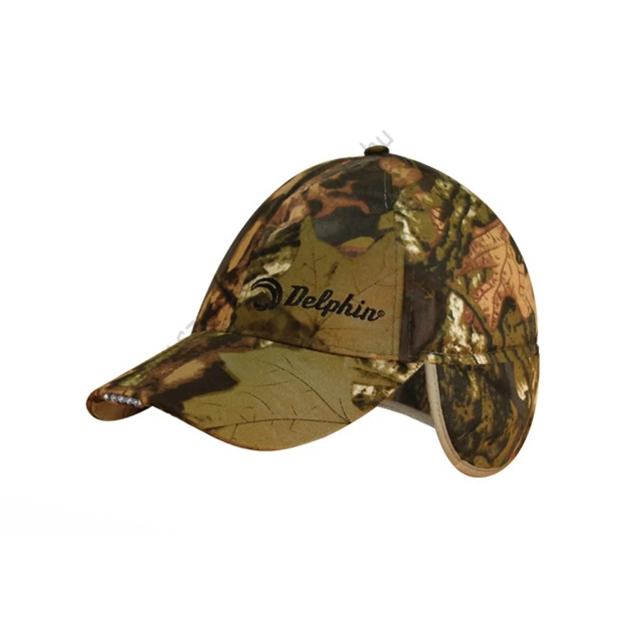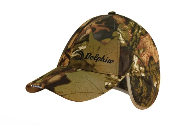 Téli sapka – siltes sapka meleg béléssel és LED diódákkal a Delphin márkától álcázó kivitelben. A sapka mérete univerzális, és a hátsó részén található gumis behúzó mechanizmus segítségével pontosan beállítható az igényelt kerület., hogy mindenkin kényelmesen üljön. Óriási előnye az elülső részén elhelyezett 5 db LED dióda, amelyeket rossz látási viszonyok között használat. A LED diódák elegendően erős fényáramot bocsátanak ki, így némely esetekben a LED fejlámpákat is felválthatják. A LED diódák kapcsolója feltűnésmentesen a sapka hátoldalán van elhelyezve, azokat a hátsó részen található 2 db lapos elem táplálja, amelyek a csomagolás részét képezik! További előnye a fül és nyakrészen található nyitható bélés, amely szükség esetén megbízhatóan betakarja ezeket a testrészeket, ezáltal megvédi azokat a hűvös környezeti viszonyoktól.