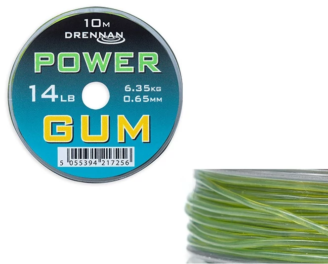 A Power Gum (erőgumi) harmónikus átmenetet képez a vastag főzsinór és a vékonyabb horogelőke között. Viszonylagos merevsége a gubancok kialakulását is gátolja. Nyúlása kb. kétszeres, ami nem veszélyezteti a bevágás hatékonyságát, viszont meggátolja az előke szakadását hirtelen fellépő erőhatások esetén. Nagy segítségünkre lehet akkor, amikor a halak nagyon finoman esznek, és szükség van az előke és a horogméret végletekig történő lefinomítására. A nagyobb halak ilyenkor megtréfálhatnak minket, de ha a Drennan Power Gum-ot beiktatjuk a szerelékünkbe, biztosan nem ér minket meglepetés!