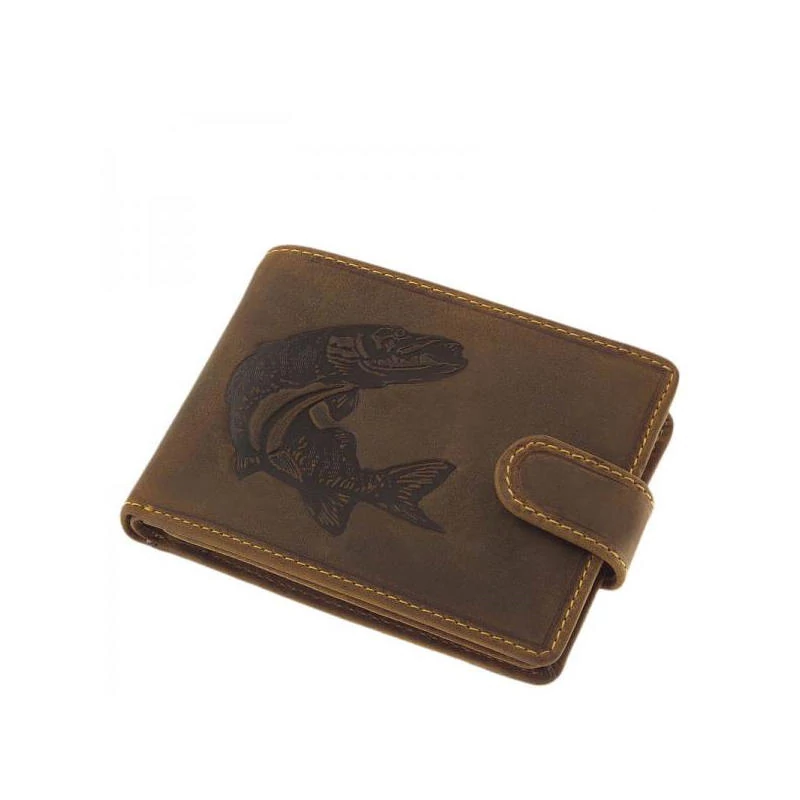 Rendkívül szép külső felülettel ellátott horgász férfi pénztárca, rusztikus, pull up bőrből igényesen legyártva. Fedelét egy csuka aprólékosan kidolgozott képe díszíti. Ez az exkluzív pénztárca belül aprópénztartóval, kétrekeszes papírpénztartóval, továbbá új megoldású kártya- és igazolványtartó résszel rendelkezik. Külső átkapcsoló pántos modell.