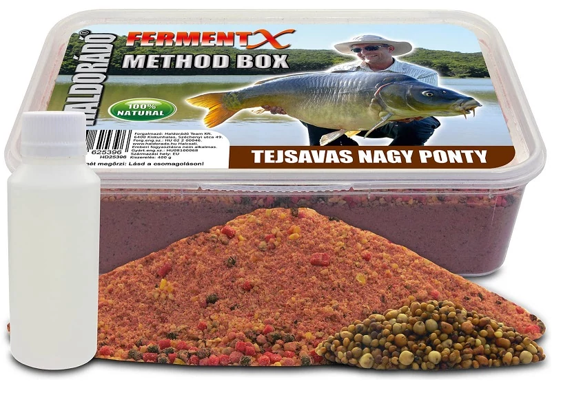 A FermentX Method Box tartalma: - 400 gramm száraz, ízesített etetőanyag - 100 gramm erjesztett aprómag - 100 ml erjesztett folyadék Használatba vétele: öntse ki a doboz tartalmát egy vödörbe. A száraz etetőanyagra öntse rá az erjesztett folyadékot, majd öntsön rá pont ugyanennyi (1 flakon) vizet. Keverje ezt jól össze, majd 10-15 perc után törje át törőszitán. Ezután akár egyben, akár részletekben adagolva hozzá lehet keverni az erjesztett aprómagokat. Ha menet közben szárad, vagy nem tapad eléggé a keverék, igény szerint lehet és kell a nedvességet pótolni, amelyhez vízpermetező a legjobb megoldás!