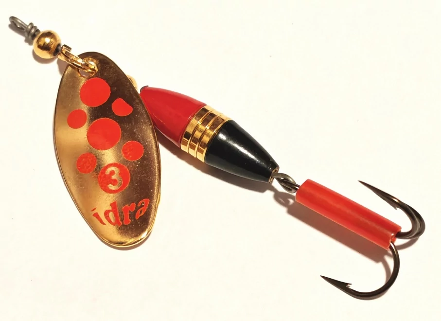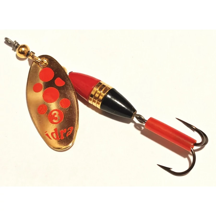 IDRA KÖRFORGÓ VILLANTÓ FEKETE-ARANY-PIROS 3-AS 7,5G Az Idra fém műcsalik mára feledésbe merültek, pedig régen rengeteg szép halat adtak a horgászoknak. A csali minőségi, rozsdamentes, ídőtálló anyagból készültek. Jelen típus teljes hossza kb 6,5cm, súlya 7,5g. Kis mérete ellenére súlya jelentős, jól dobható csaliról beszélünk, színezete miatt leginkább nappali, viszonylag tiszta vízben történő horgászatra ajánljuk. Szúnyog Horgászbolt - www.szunyoghorgaszbolt.hu