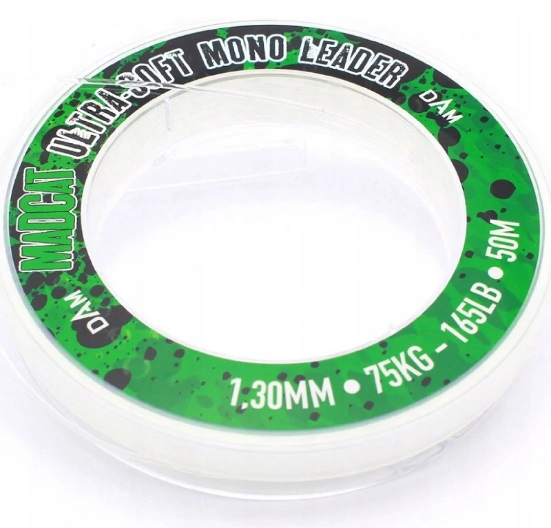 MADCAT ULTRA-SOFT MONO LEADER 50M 1,30MM 75KG Nagy kopásállóságú monofil harcsaelőkék készítéséhez. Olyan puha, hogy nagy átmérője ellenére könnyen csomózható. Szúnyog Horgászbolt - www.szunyoghorgaszbolt.hu
