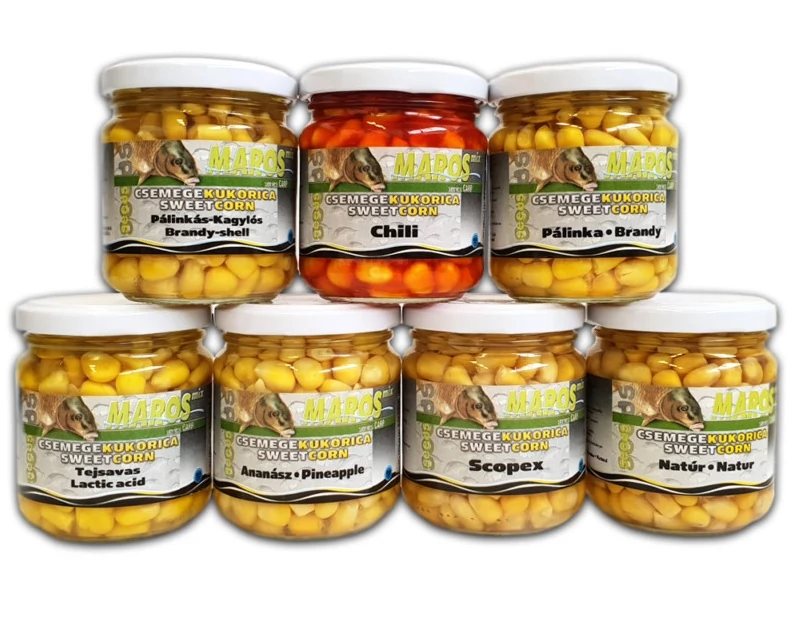 A pácolt, kifogástalan minőségű színezett kukoricaszemeket gondosan válogatják, emiatt évek múltán is megőrzik frissességüket és fogósságukat. Fenekező vagy úszós horgászmódszernél egyaránt bevethető. 220 ml-es csavaros üvegben kerülnek forgalomba.