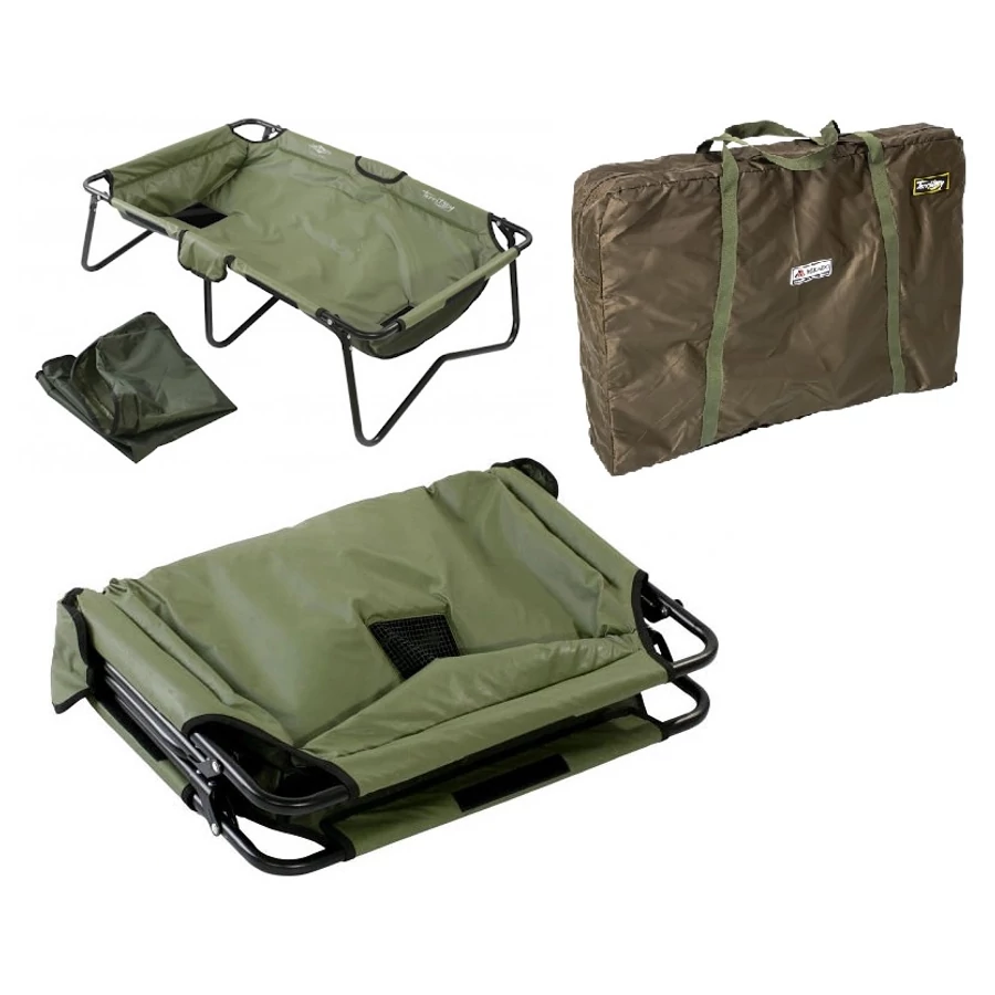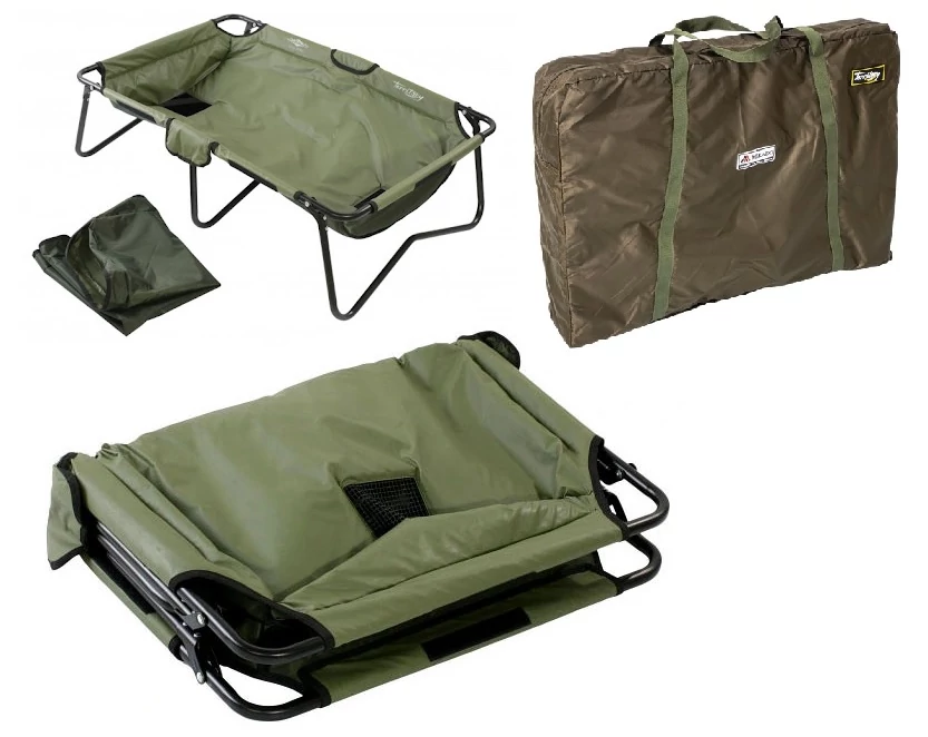 Az erős, stabil fémvázon lévő vízlepergető, párnázott anyag maximális védelmet nyújt akár egy nagyobb testű pontynak, amurnak a horogszabadítás, fényképezés során. A bölcső alján lévő hálós részen a víz könnyedén távozik. A takaróhuzatnak köszönhetően óvhatjuk a halat a fénytől, így könnyebben megnyugszik a fotózáshoz.Hordtáskával szállítjuk. Szerkezetileg úgy lett kialakítva, hogy félbe hajtható, így kis helyen is elfér.