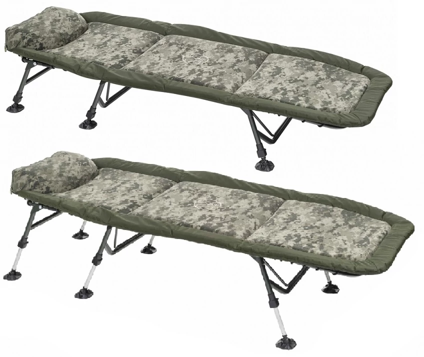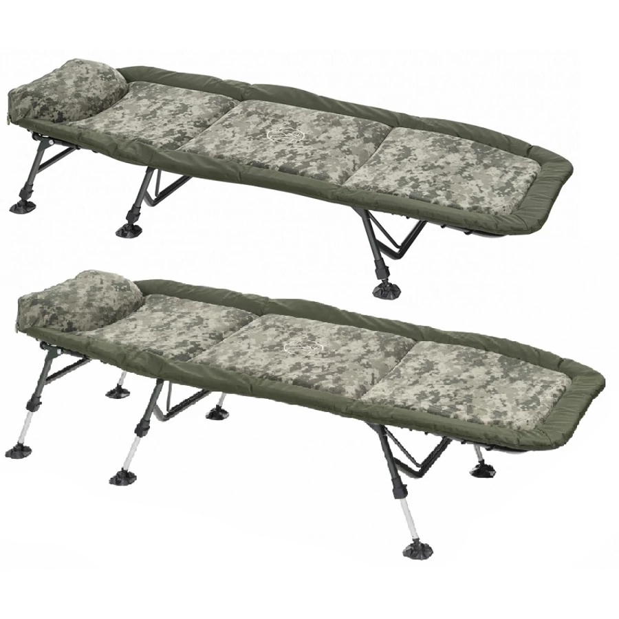 Egy extra könnyű és teljesen lapos bojlis ágy digital camouflage színben! A vastag matrac egy polár külső réteggel maximális kényelmet nyújt a vízparton. Az matrac keménysége állítható a középrészen kialakított heveder segítségével. A teleszkópos lábaknak köszönhetően bármely terepviszonyok között könnyedén beállítható. A fejpárna rész cipzározható, a bélés kivehető.