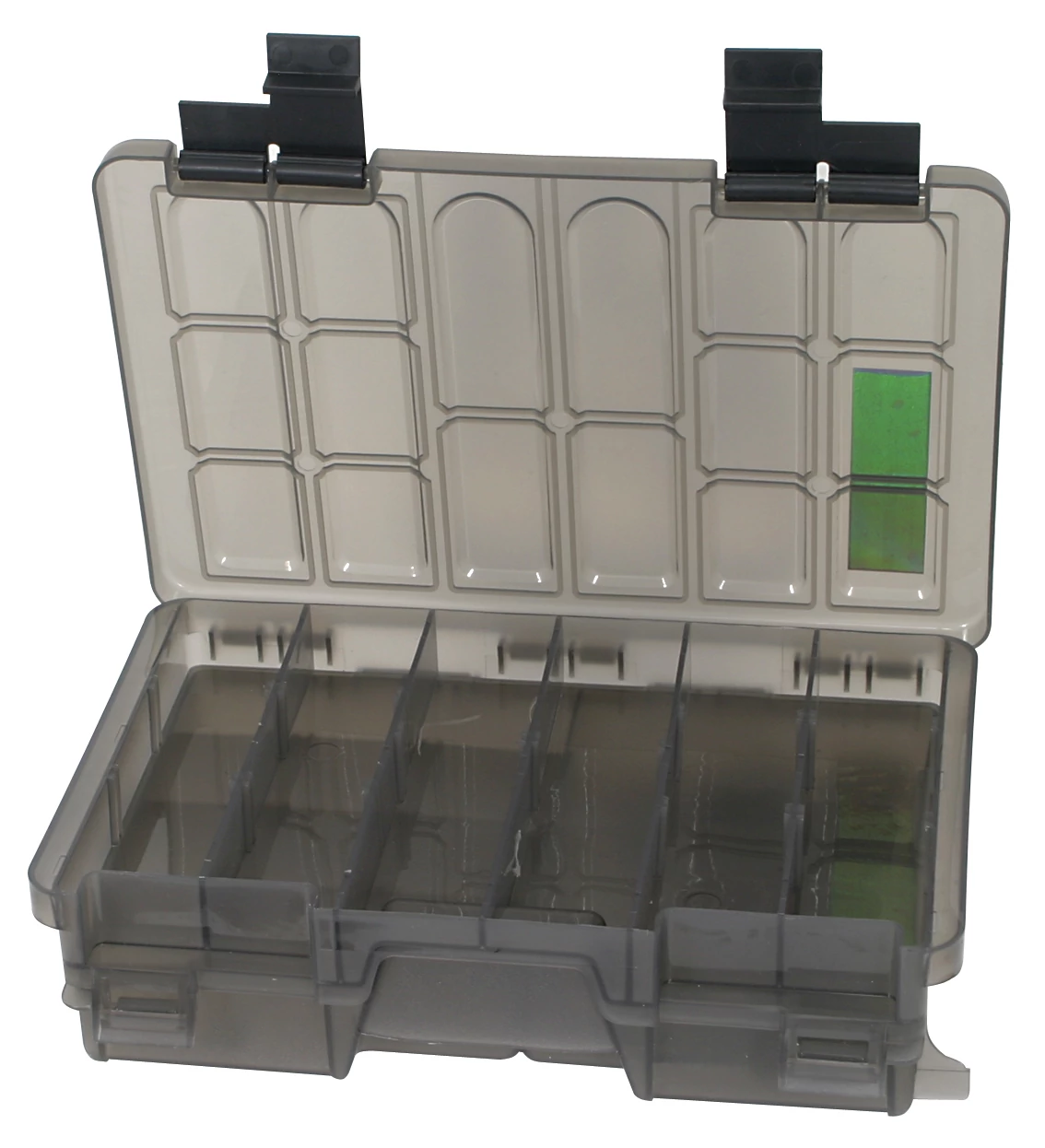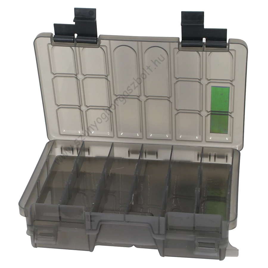 Kétoldalas tárlódobozok, osztható rekeszekkel. Minden horgászati típushoz praktikus kiegészítő . Rablóhalas mű csalik, feederes kiegészítők ,úszós aprócikkek is kényelmesen tárolhatók benne . A gumi csaliknak is tökéletesen ellenáll nem olvadnak szét benne. Tulajdonságok: -2 részes -állítható fakkok -36 x 22 x 7cm