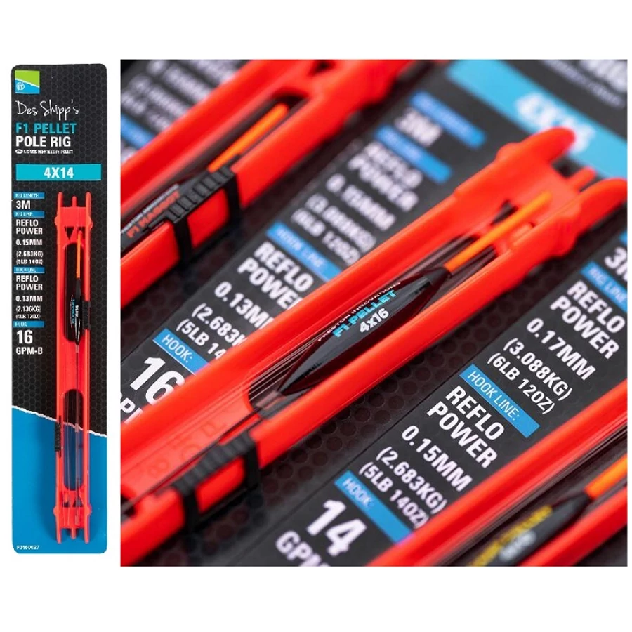 PRESTON 4X16 F1 PELLET POLE RIG ELŐKÖTÖTT RAKÓS SZERELÉK A legkifinomultabb alkatrészekből,a Preston saját tanácsadói által összeállított rakósbotos előkötött szerelék, amely Des Shipp nevéhez fűződik. Ezek a szerelékek tökéletesen alkalmasak bármilyen vízterületen.