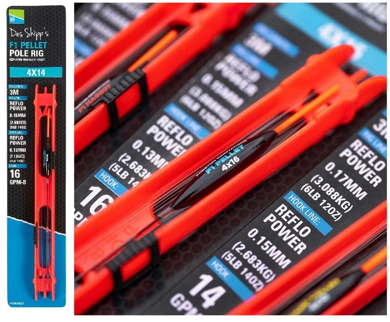 A Preston F1 Pellet Pole Rigs úszók 1,5 mm-es üreges antennával és és rugalmas Niti drótszárral rendelkeznek, melyek tökéletesen alkalmasak minden F1-es (ponty kárász hybrid) horgászatra és pontyozásra a hűvösebb hónapokban, miközben a 16-os horognak megfelelő 2-6 mm-es pellet horogcsalit használunk. A kukorica is hatékonyan használható ezen a szereléken.