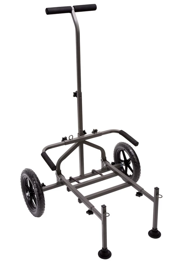 Ez a sokoldalú horgász kocsin biztonságban szállíthatod felszerelésedet, verseny ládádat a horgász helyre. Kihúzható oldalsó és elülső tartókkal rendelkezik, szétszedhető és összecsukható (rugós terhelés) a könnyebb tárolás érdekében. A levehető kerekek tömör habszivacs abroncsokkal rendelkeznek. Teljesen szétszerelve kis helyet foglal el. Rendelkezik 2 db gumipókkal is, így szállítás előtt fixen rögzíthetjük felszerelésünket.