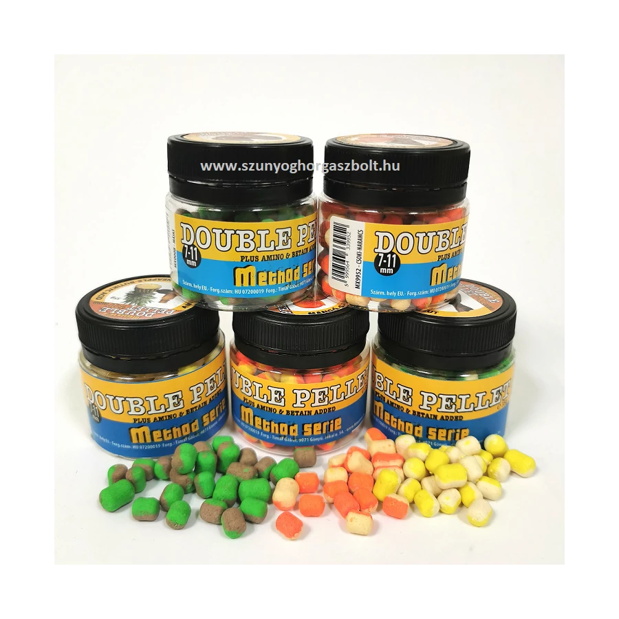 A modern feederes horgászatok követelményei egyre magasabb színvonalú és egyre jobb minőségű csalikat követelnek meg. Erre nyújt megoldást a Double Pellet! Ez egy két különböző színből álló POP-UP csali, mely kiváló választás lehet akkor, mikor nem tudjuk eldönteni, hogy sötétebb vagy világosabb színű horogra való lenne ideális. Kilenc különböző aromája és két mérete közül pedig mindig ki tudjuk választani az adott körülményekhez legjobban illő változatot.